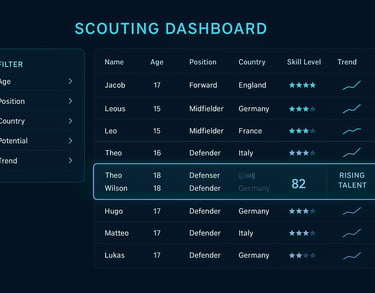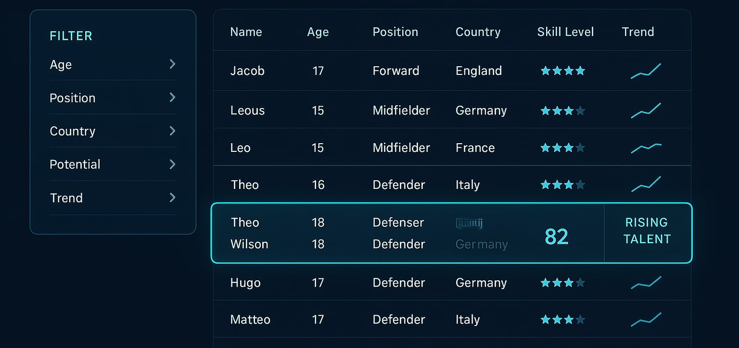 Profesjonalny panel pozwala filtrować graczy po: wieku, pozycji, kraju, poziomie, indeksie potencjału i trendach rozwoju.